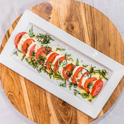 Freshly sliced Roma tomatoes, wet mozzarella, fresh basil, lightly seasoned with a delicious blend of olive oil and spices.